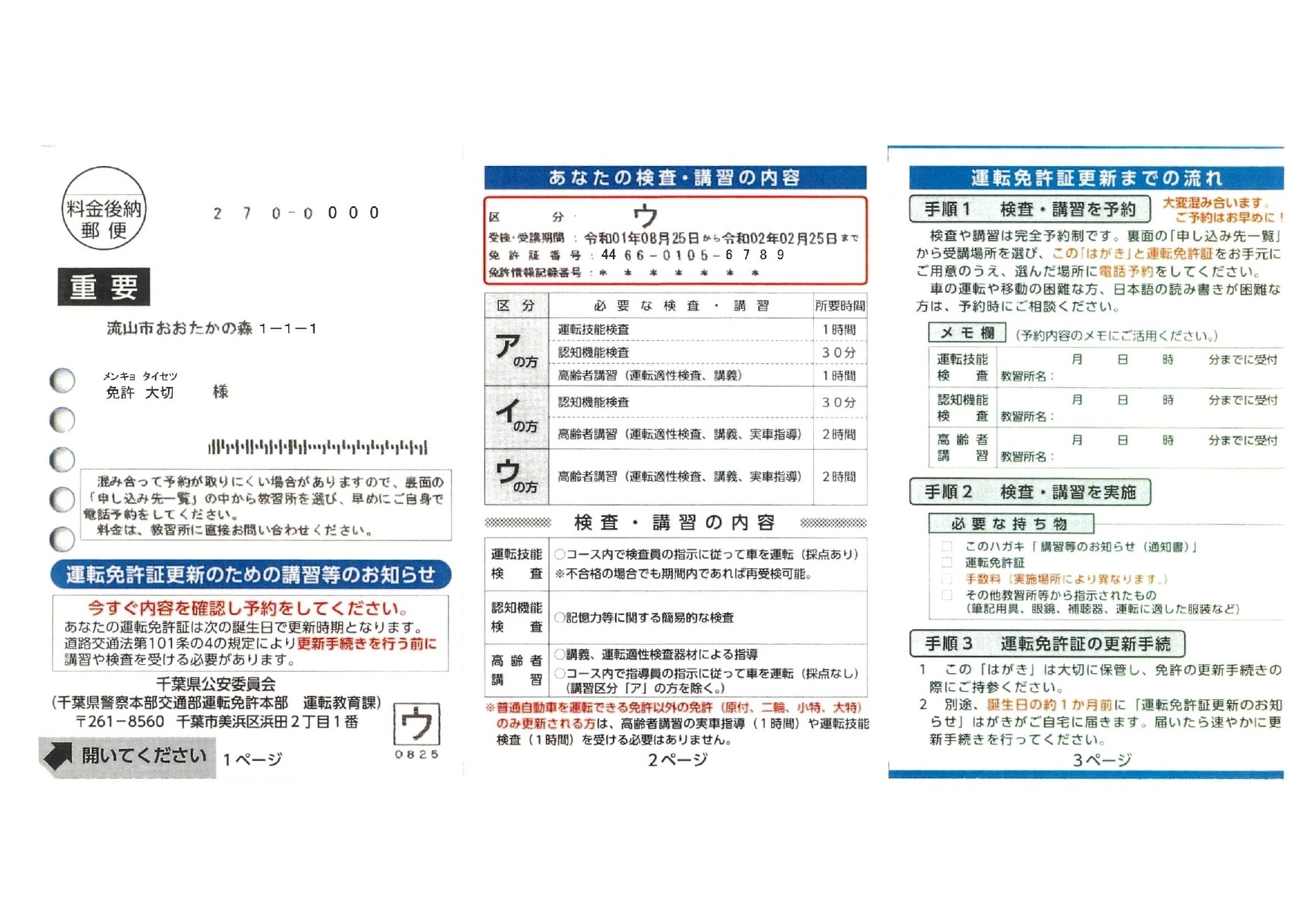 | 更新時75歳以上の方 | 先ずは認知機能検査を予約後、受講して頂きます。‥2,000円 認知機能検査の結果は、次の2つ(①又は②)です。 ①「認知症のおそれがある」場合 → 医師の診断を受ける又は再受験可 ②「認知症のおそれがない」場合 → 下記の(1)又は(2)のどちらかを受講して頂きます。 ※講習又は検査は、予約制で別日になります。 (1)通知ハガキに運転技能検査が”不要”と記載されている 普通車免許以上の保有者‥2時間講習 8,000円 原付免許又は小特免許のみの保有者‥1時間講習 4,000円 (2)通知ハガキに運転技能検査が”必要”と記載されている 運転技能検査 5,000円 (課題速度、一時停止や信号等交差点、段差乗り上げ等) 運転技能検査に合格した方‥1時間講習 4,000円 運転技能検査が不合格の方‥運転免許の更新はできません。 ※なお、再受験は可能です。 ※又は、原付免許に格下げ後、運転免許更新ができます。(1時間講習受講が必要) |